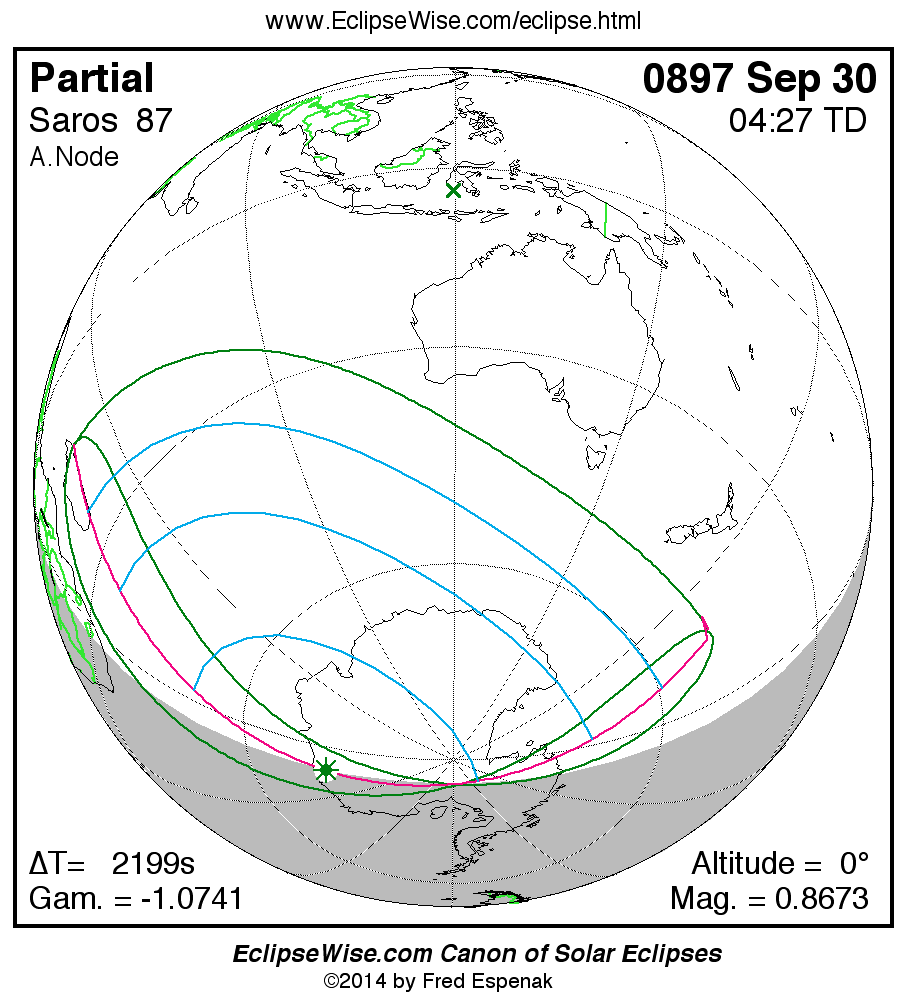 The instant of greatest eclipse takes place on 0897 Sep 30 at 04:27:17 TD (03:50:39 UT1).