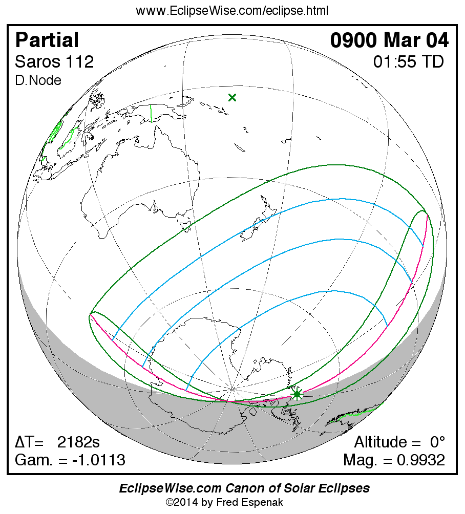 The instant of greatest eclipse takes place on 0900 Mar 04 at 01:54:37 TD (01:18:15 UT1).