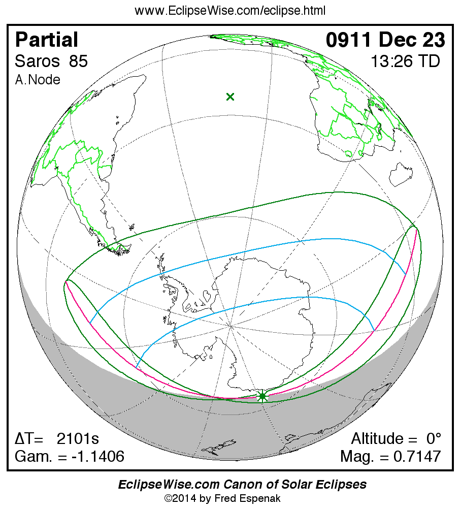 The instant of greatest eclipse takes place on 0911 Dec 23 at 13:26:30 TD (12:51:30 UT1).