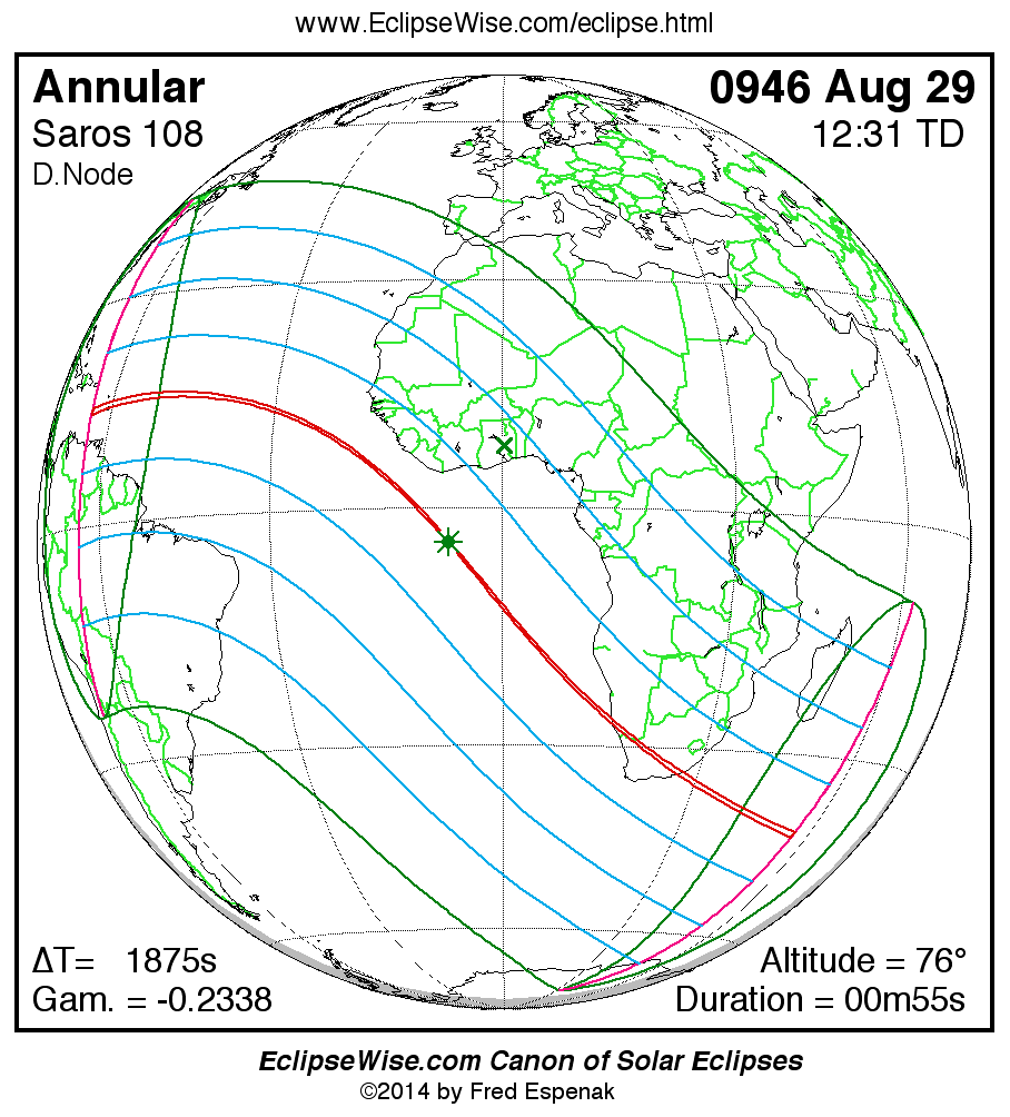 The annular solar eclipse of 0946 Aug 29 is preceded two weeks earlier by a penumbral lunar eclipse on 0946 Aug 15.