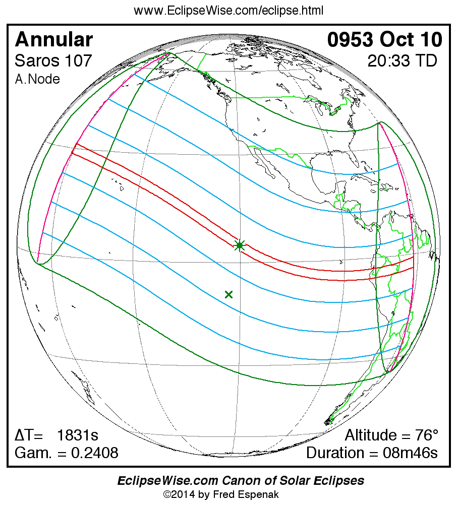 - Path Table: Annular Solar Eclipse of 0953 Oct 10 - coordinates of the central line and path limits