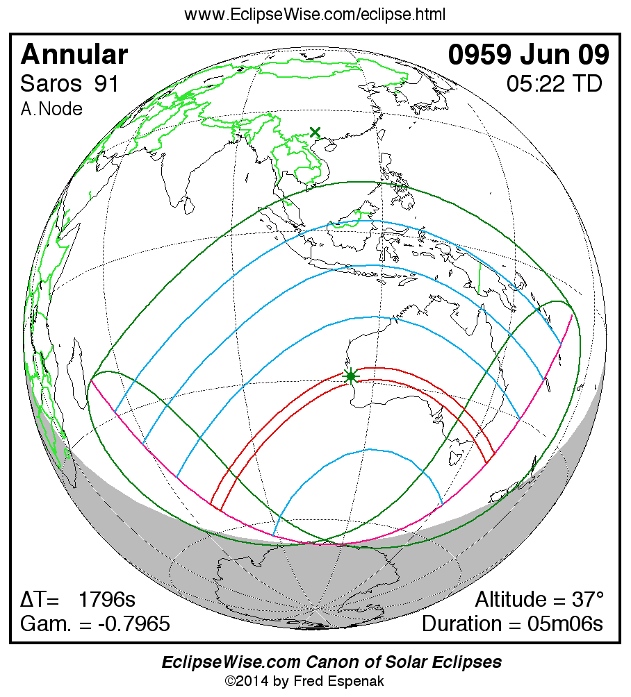 The instant of greatest eclipse takes place on 0959 Jun 09 at 05:21:57 TD (04:52:01 UT1).