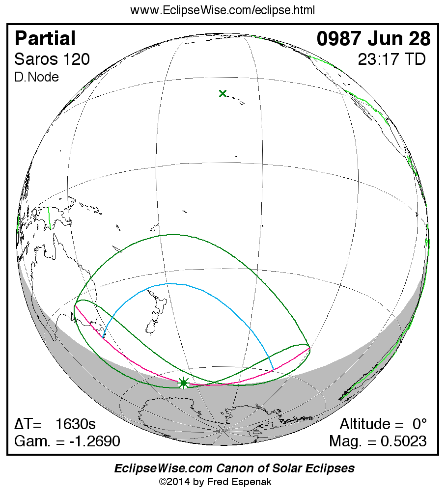 The instant of greatest eclipse takes place on 0987 Jun 28 at 23:17:25 TD (22:50:15 UT1).