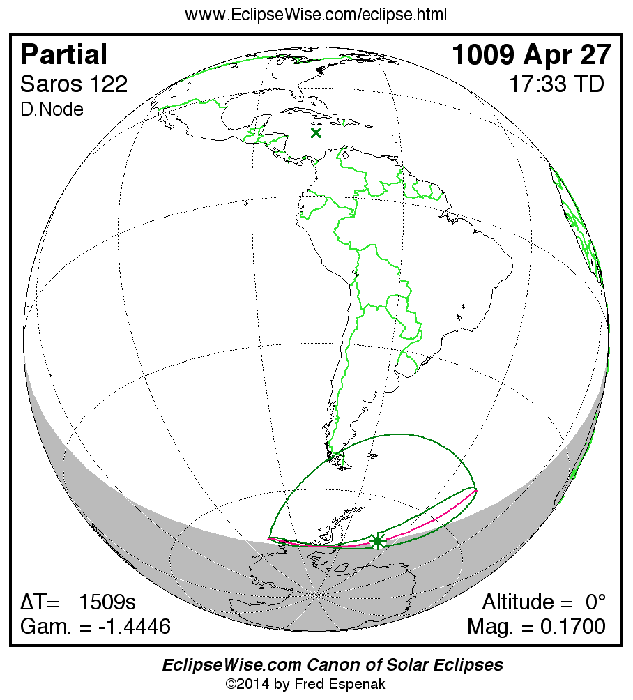 The instant of greatest eclipse takes place on 1009 Apr 27 at 17:32:59 TD (17:07:50 UT1).