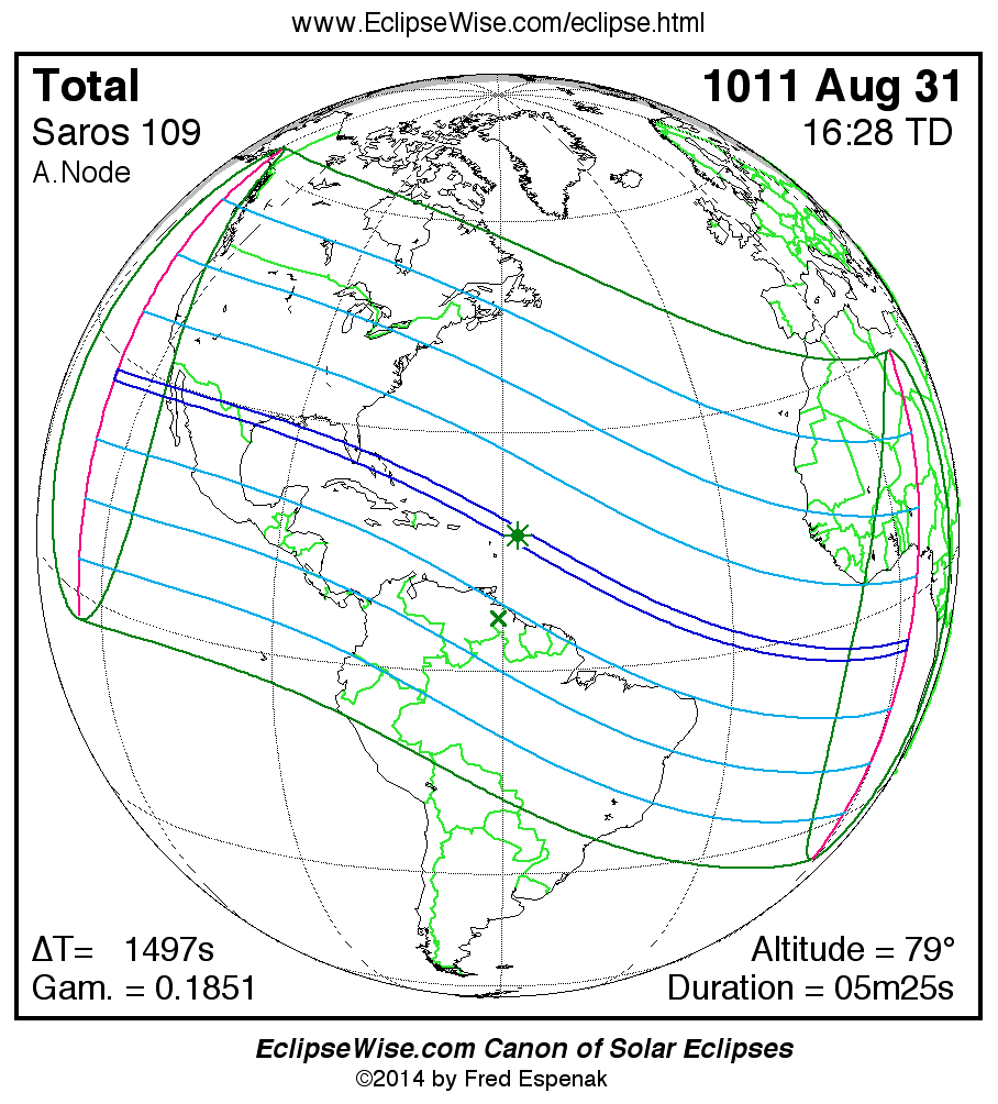 - Path Table: Total Solar Eclipse of 1011 Aug 31 - coordinates of the central line and path limits