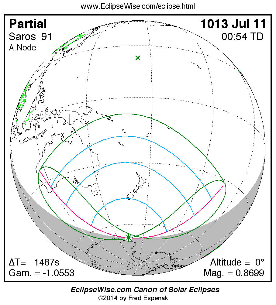 The instant of greatest eclipse takes place on 1013 Jul 11 at 00:53:51 TD (00:29:05 UT1).