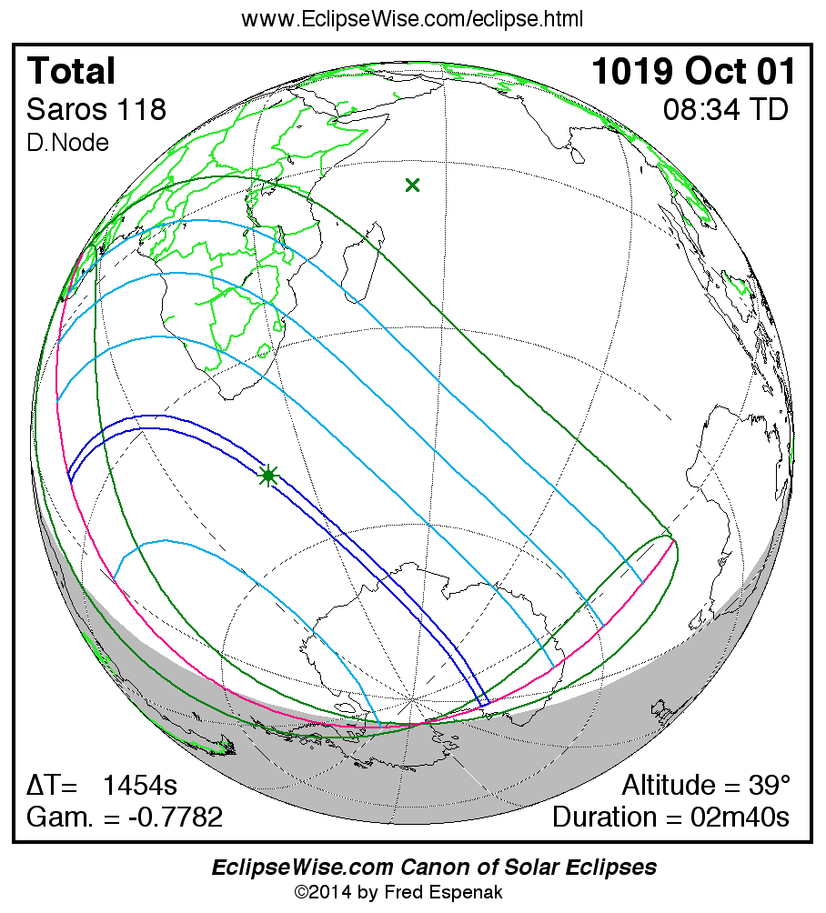 The instant of greatest eclipse takes place on 1019 Oct 01 at 08:34:15 TD (08:10:01 UT1).
