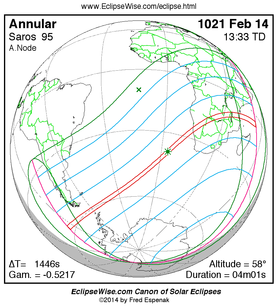 The instant of greatest eclipse takes place on 1021 Feb 14 at 13:33:22 TD (13:09:16 UT1).