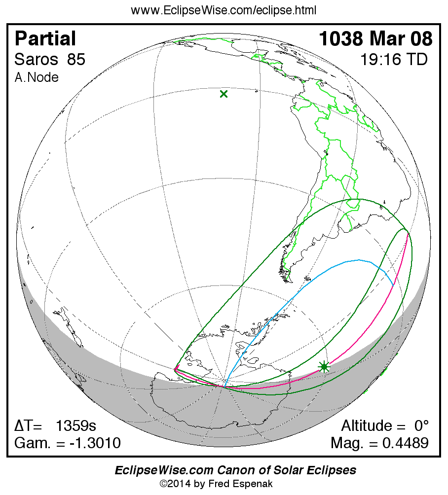 The instant of greatest eclipse takes place on 1038 Mar 08 at 19:16:30 TD (18:53:51 UT1).