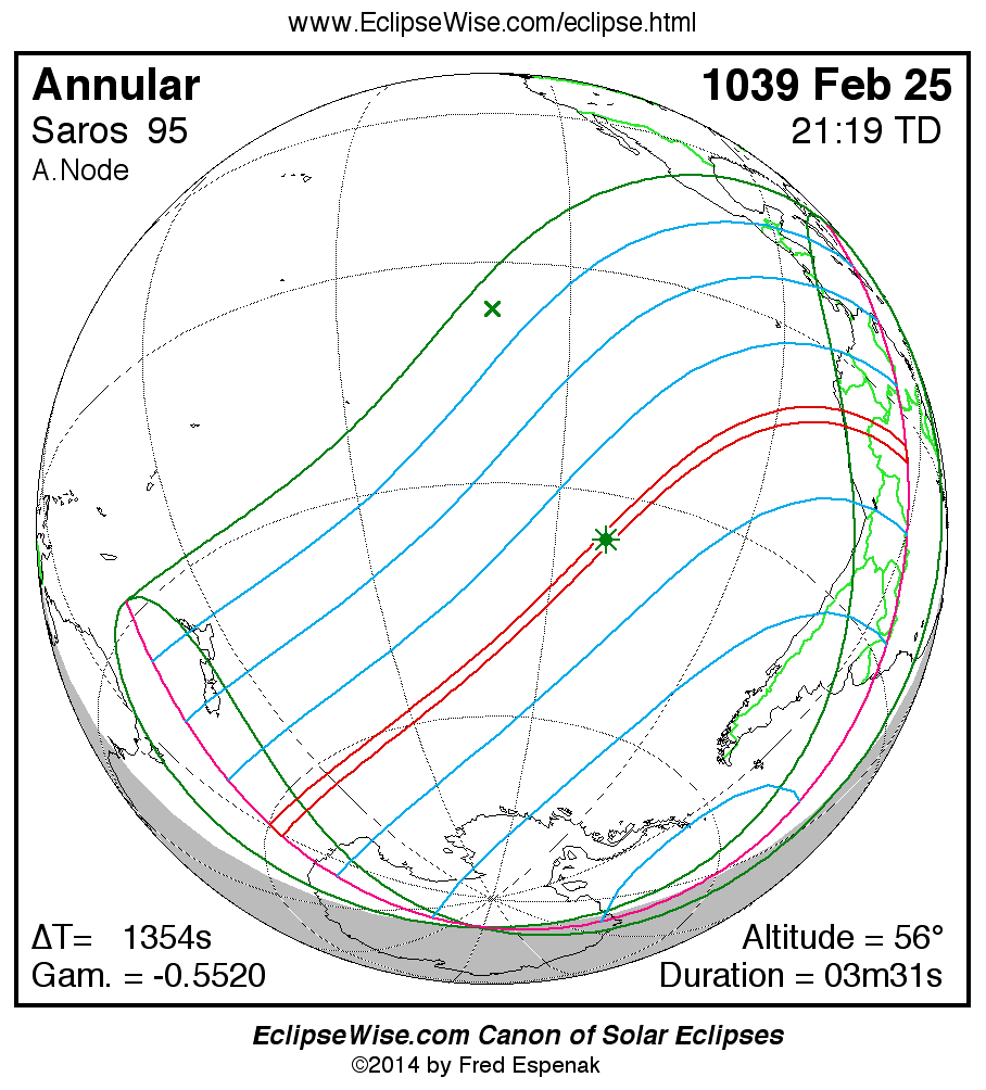 The instant of greatest eclipse takes place on 1039 Feb 25 at 21:18:48 TD (20:56:14 UT1).