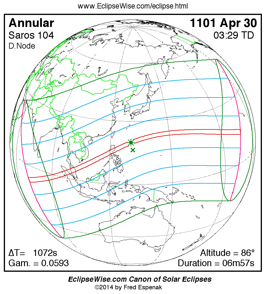 - Path Table: Annular Solar Eclipse of 1101 Apr 30 - coordinates of the central line and path limits