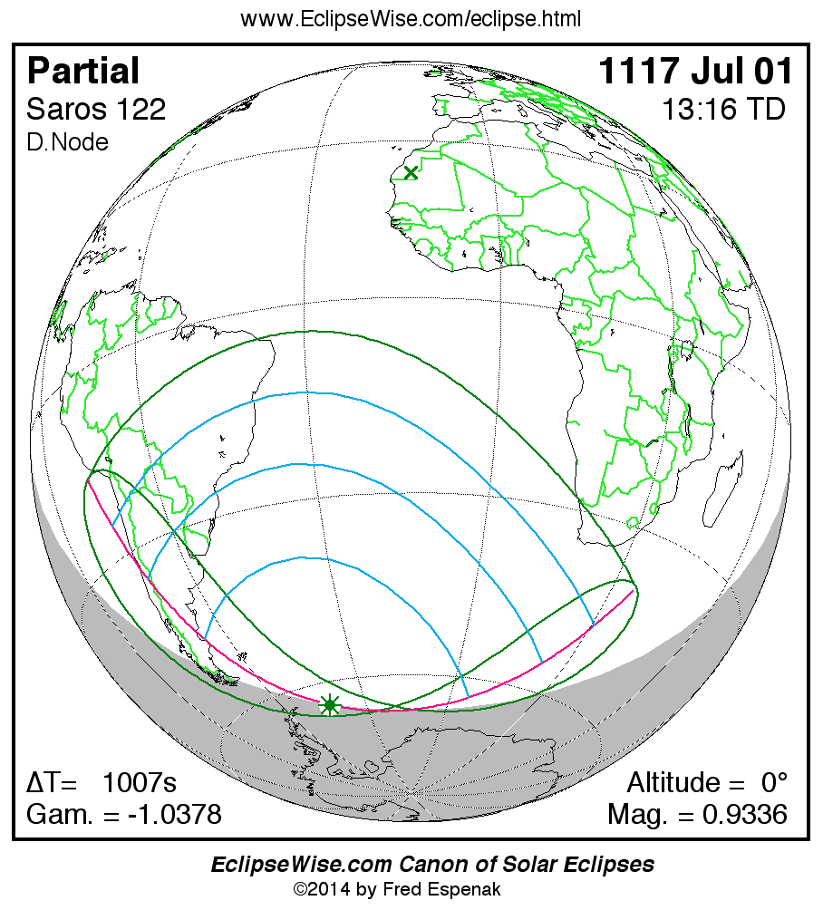 The instant of greatest eclipse takes place on 1117 Jul 01 at 13:16:23 TD (12:59:36 UT1).