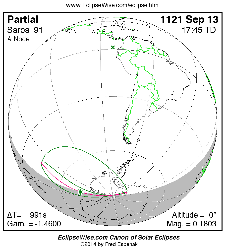 The instant of greatest eclipse takes place on 1121 Sep 13 at 17:45:15 TD (17:28:44 UT1).