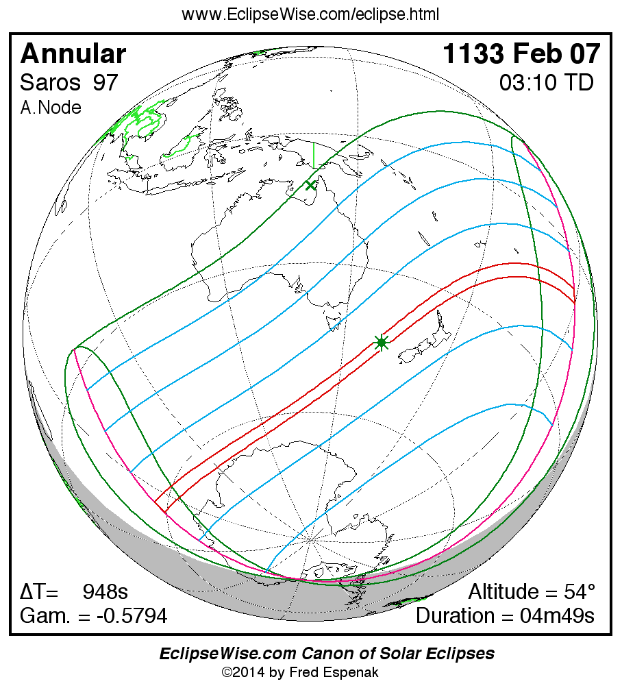 The instant of greatest eclipse takes place on 1133 Feb 07 at 03:10:04 TD (02:54:16 UT1).