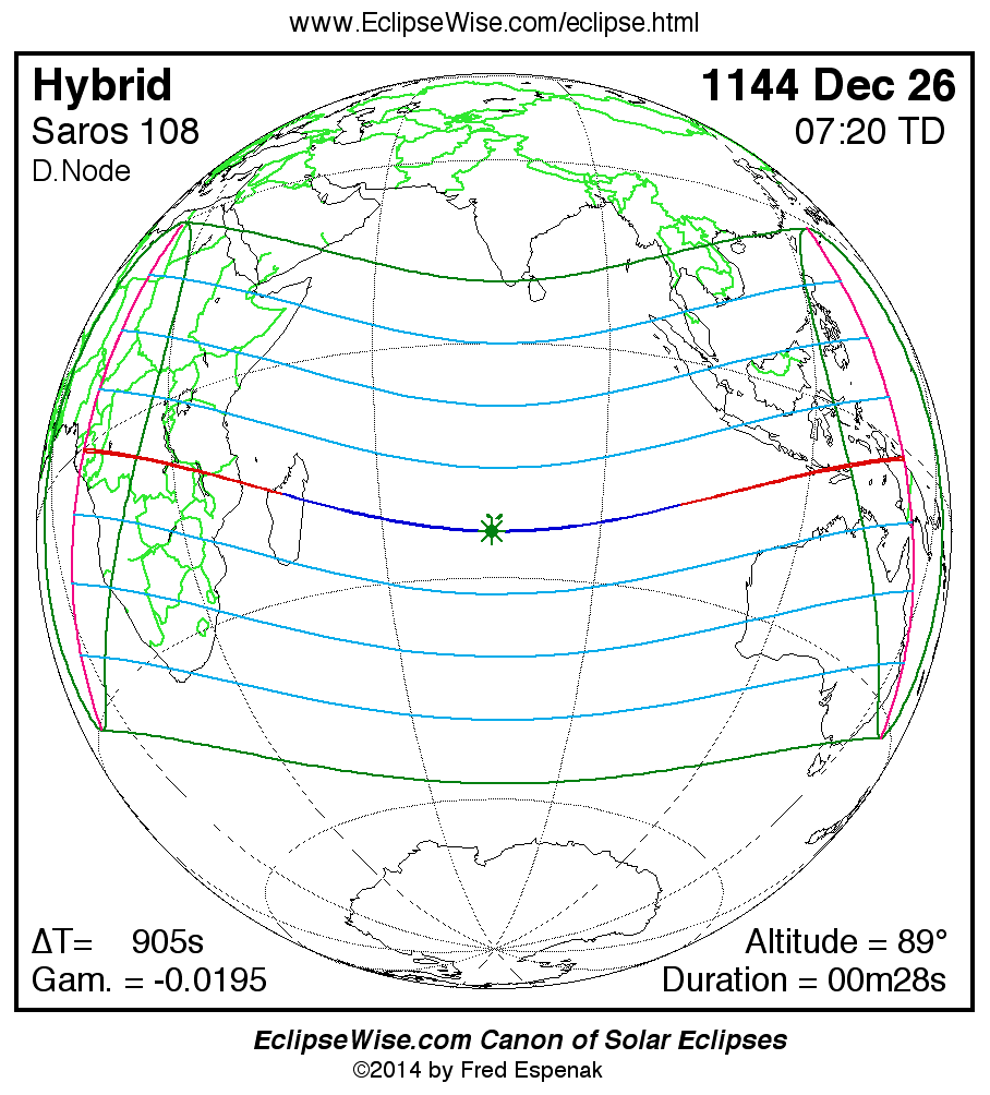 The solar eclipse of 1144 Dec 26 is one of the rare hybrid solar eclipses. In this particular case the eclipse path starts out as annular. Further down the track it changes to total and then back to annular before the path ends. It is a very short hybrid eclipse with a duration at greatest eclipse of 00m28s. The eclipse magnitude is 1.0046, while Gamma has a value of -0.0196.