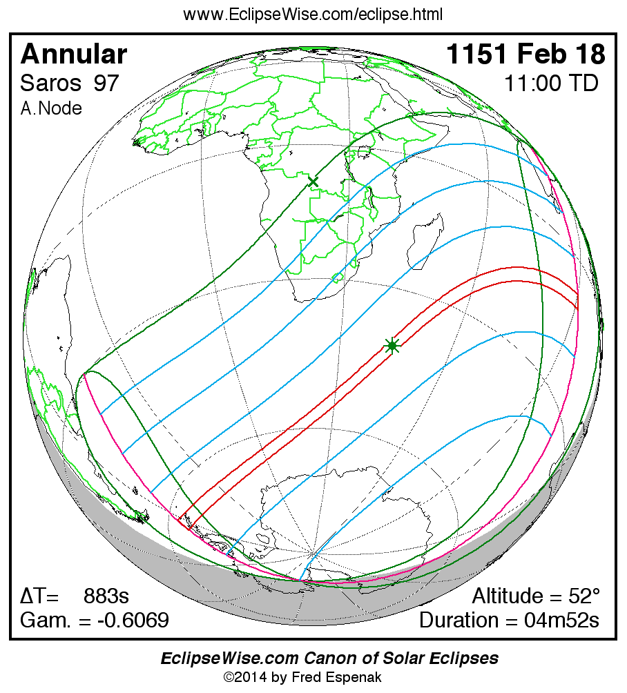 The instant of greatest eclipse takes place on 1151 Feb 18 at 10:59:58 TD (10:45:15 UT1).