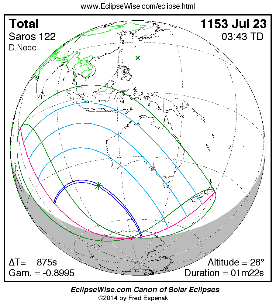 The instant of greatest eclipse takes place on 1153 Jul 23 at 03:42:34 TD (03:27:59 UT1).