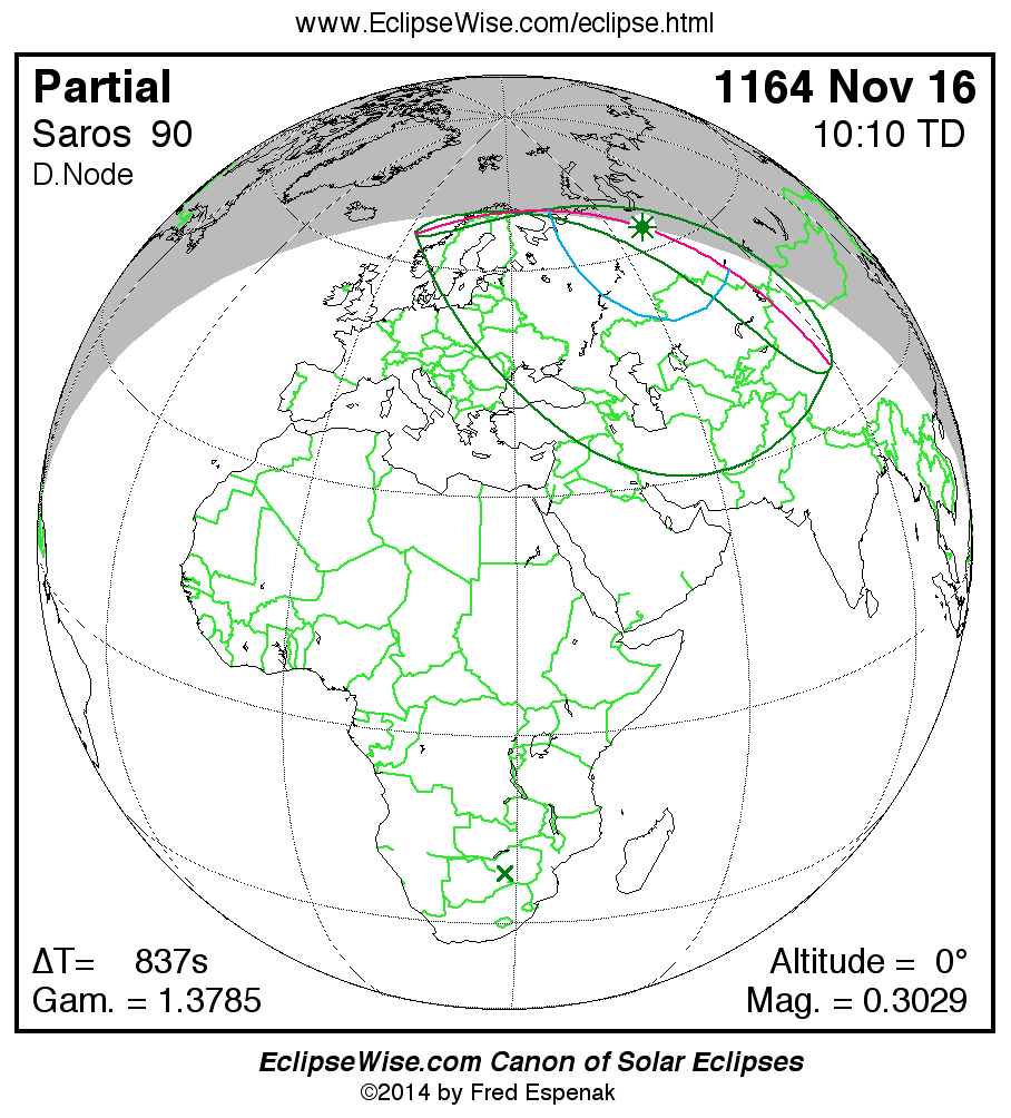 The instant of greatest eclipse takes place on 1164 Nov 16 at 10:09:39 TD (09:55:43 UT1).