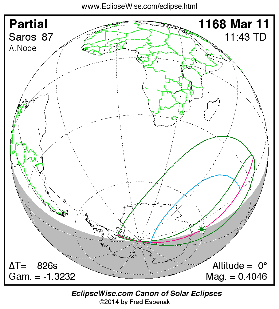 The instant of greatest eclipse takes place on 1168 Mar 11 at 11:43:05 TD (11:29:19 UT1).