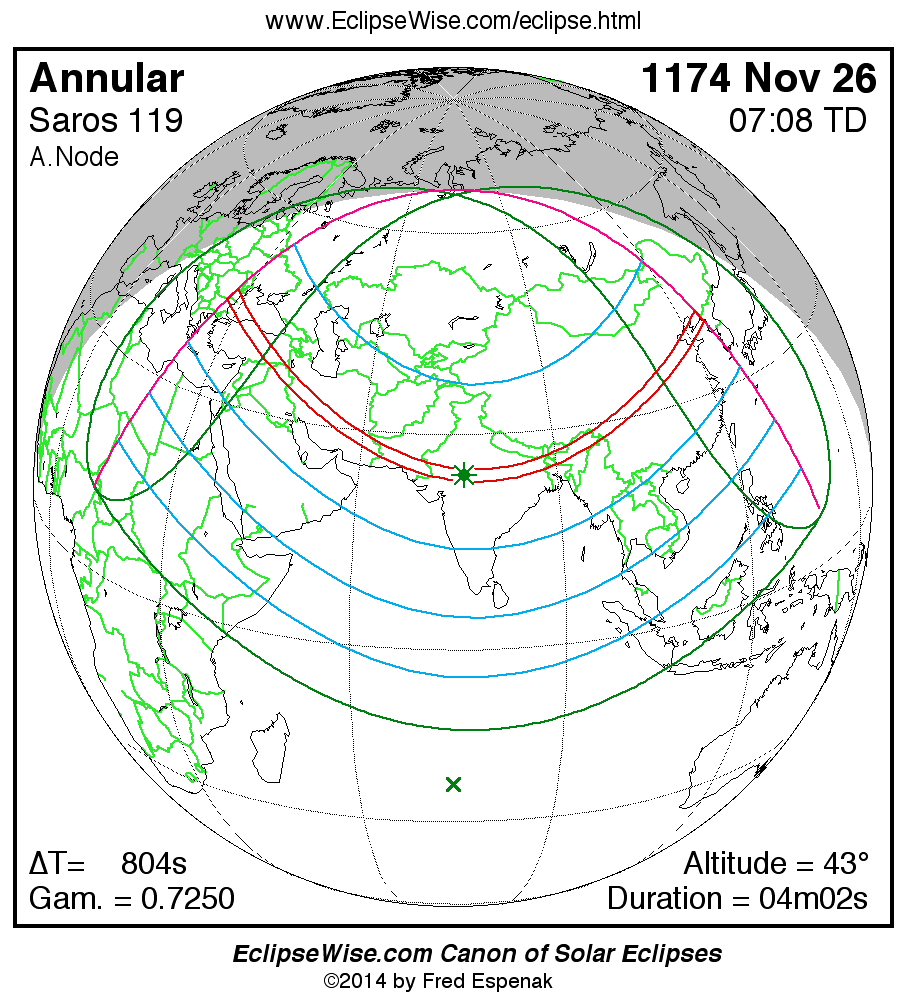The instant of greatest eclipse takes place on 1174 Nov 26 at 07:08:28 TD (06:55:04 UT1).