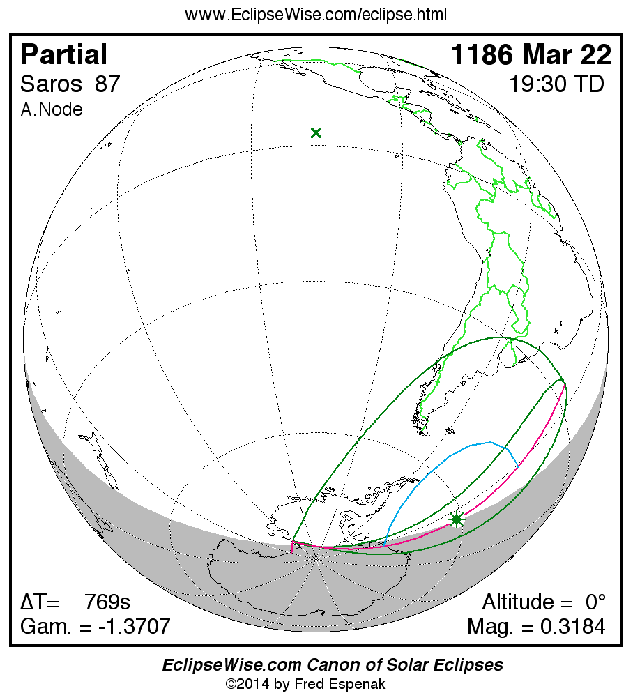 The instant of greatest eclipse takes place on 1186 Mar 22 at 19:29:30 TD (19:16:41 UT1).