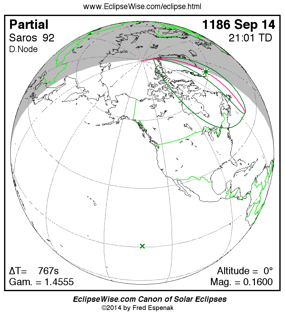 The instant of greatest eclipse takes place on 1186 Sep 14 at 21:01:13 TD (20:48:26 UT1).