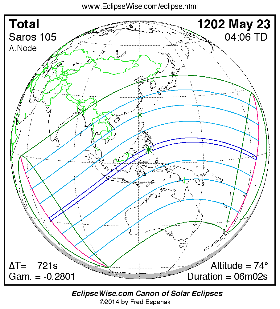 - Path Table: Total Solar Eclipse of 1202 May 23 - coordinates of the central line and path limits