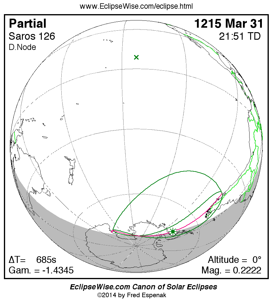The instant of greatest eclipse takes place on 1215 Mar 31 at 21:50:37 TD (21:39:13 UT1).