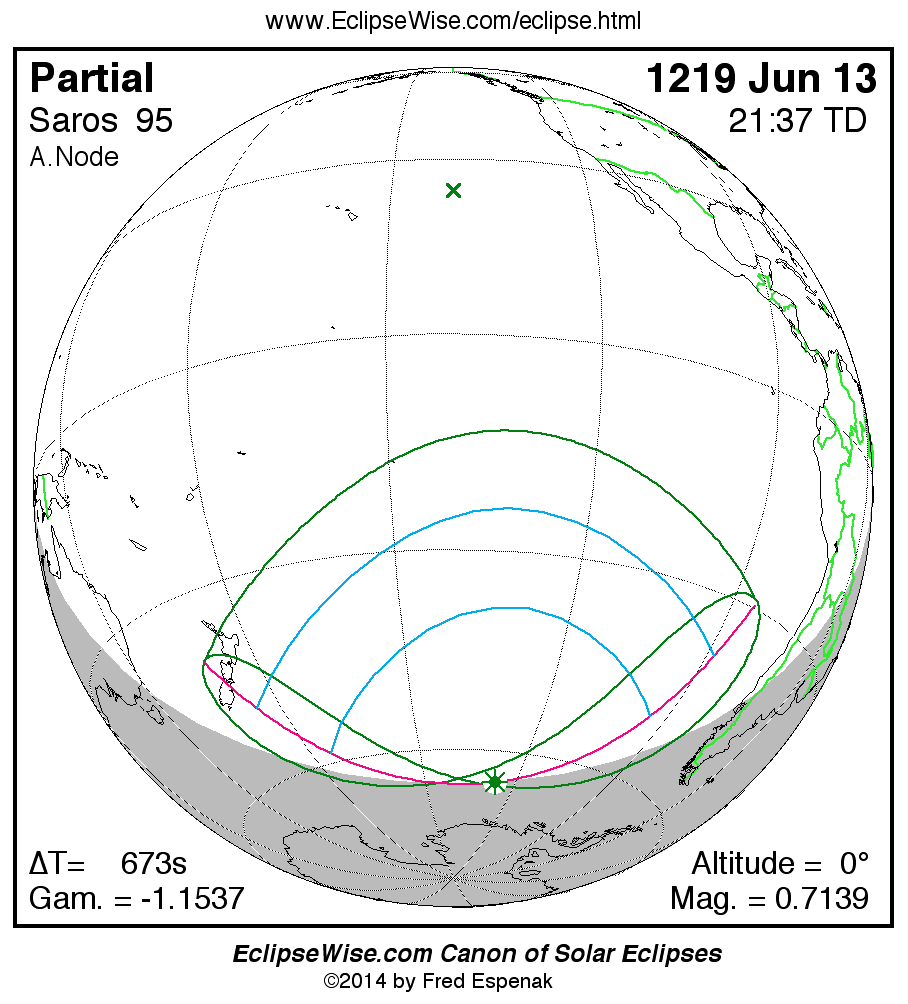 The instant of greatest eclipse takes place on 1219 Jun 13 at 21:37:14 TD (21:26:02 UT1).