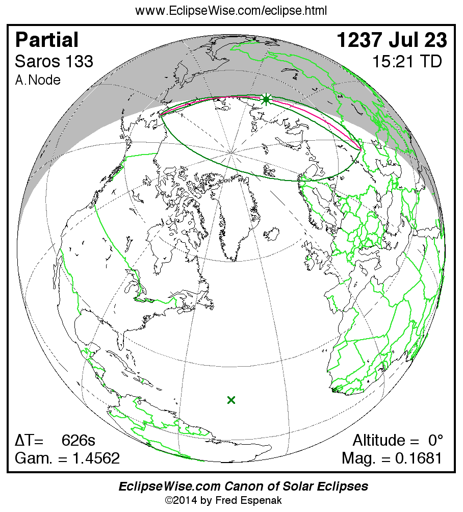 The instant of greatest eclipse takes place on 1237 Jul 23 at 15:20:40 TD (15:10:14 UT1).