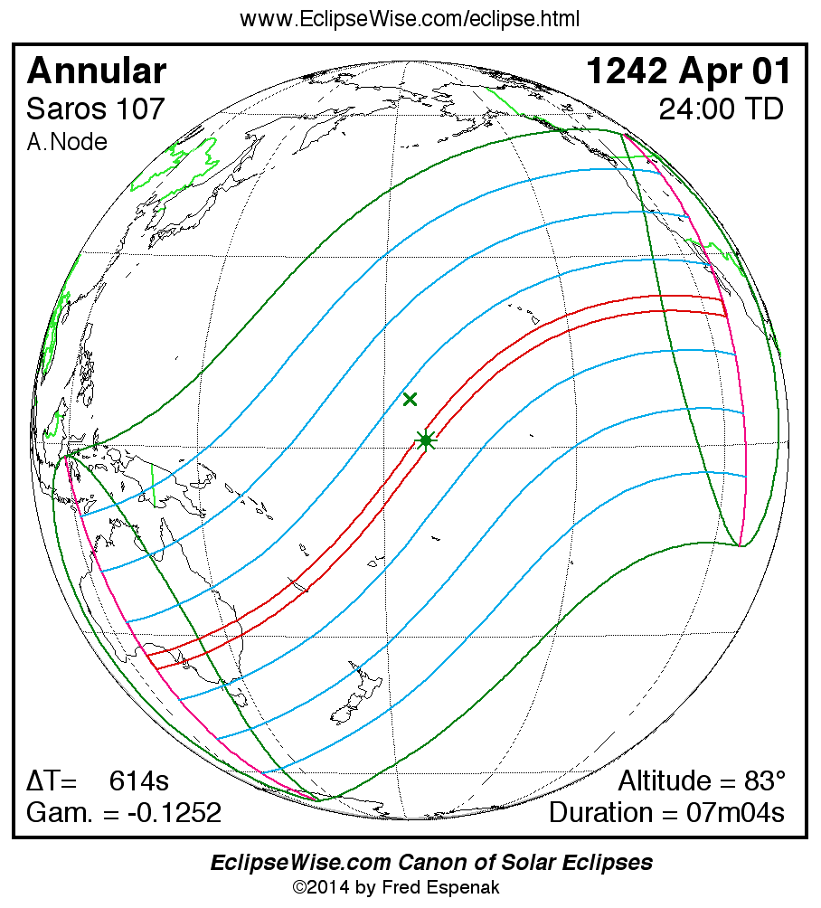 - Path Table: Annular Solar Eclipse of 1242 Apr 01 - coordinates of the central line and path limits