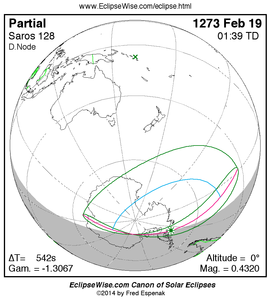 The instant of greatest eclipse takes place on 1273 Feb 19 at 01:39:00 TD (01:29:59 UT1).