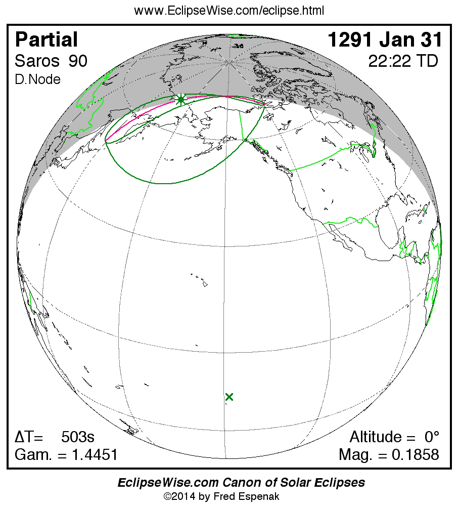 The instant of greatest eclipse takes place on 1291 Jan 31 at 22:21:40 TD (22:13:17 UT1).