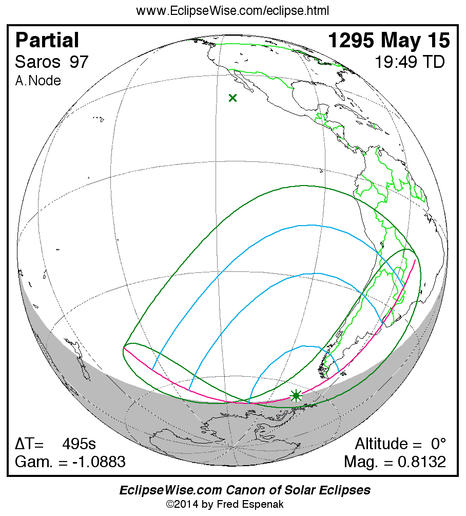 The instant of greatest eclipse takes place on 1295 May 15 at 19:48:31 TD (19:40:16 UT1).