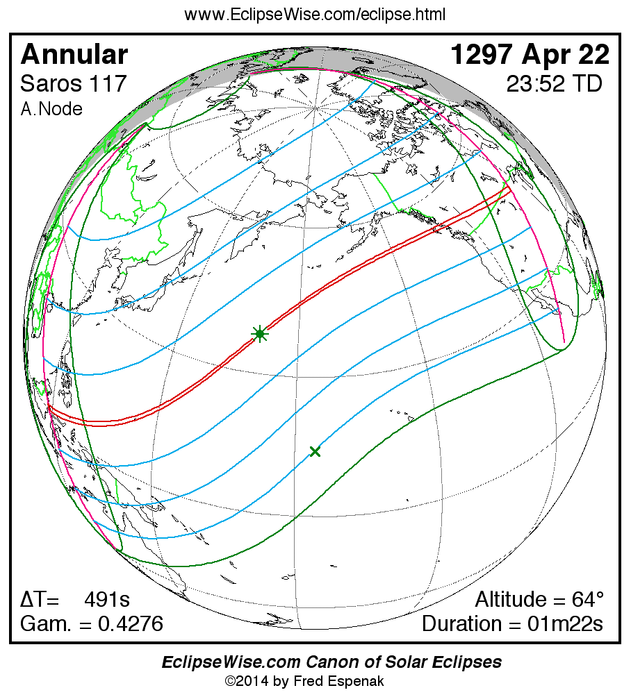 The instant of greatest eclipse takes place on 1297 Apr 22 at 23:51:53 TD (23:43:43 UT1).