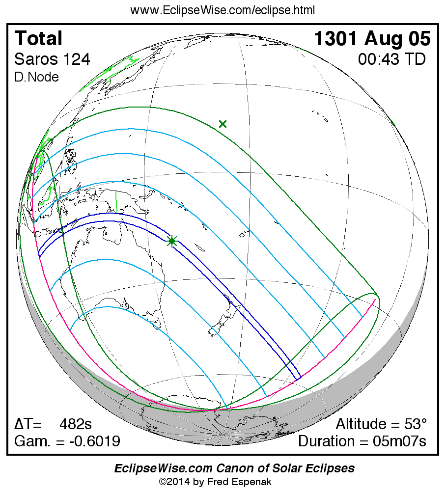 - Orthographic Map: Total Solar Eclipse of 1301 Aug 05 - global map of eclipse visibility