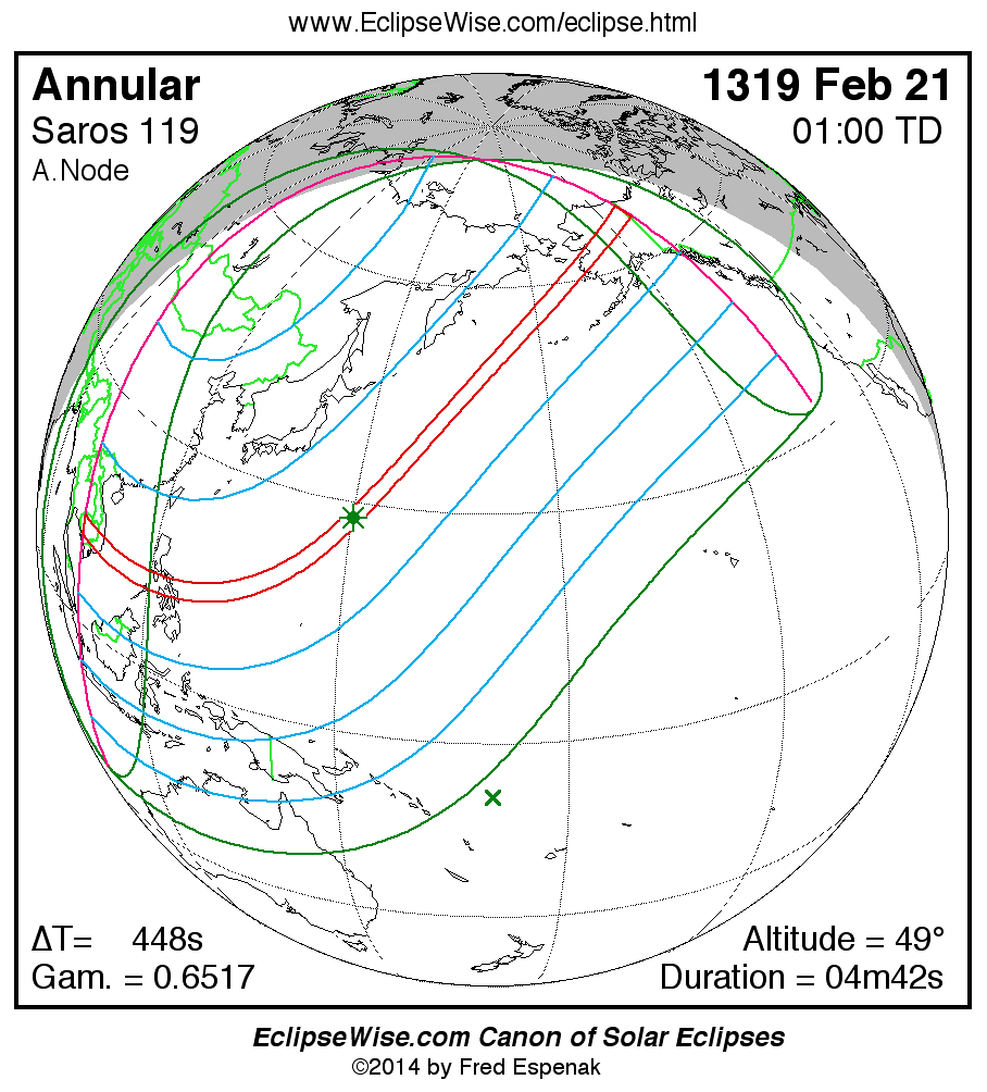 The instant of greatest eclipse takes place on 1319 Feb 21 at 00:59:41 TD (00:52:12 UT1).