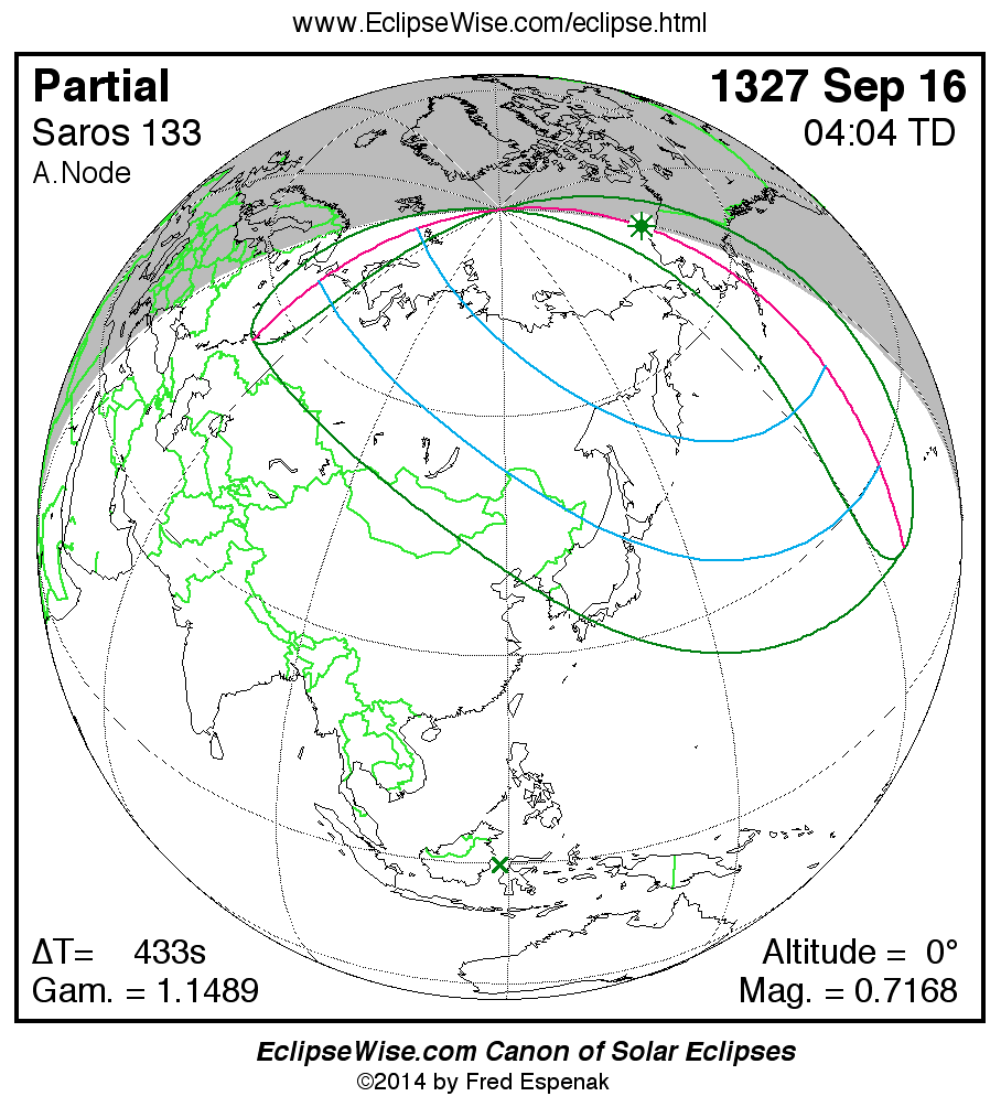 The instant of greatest eclipse takes place on 1327 Sep 16 at 04:04:26 TD (03:57:13 UT1).