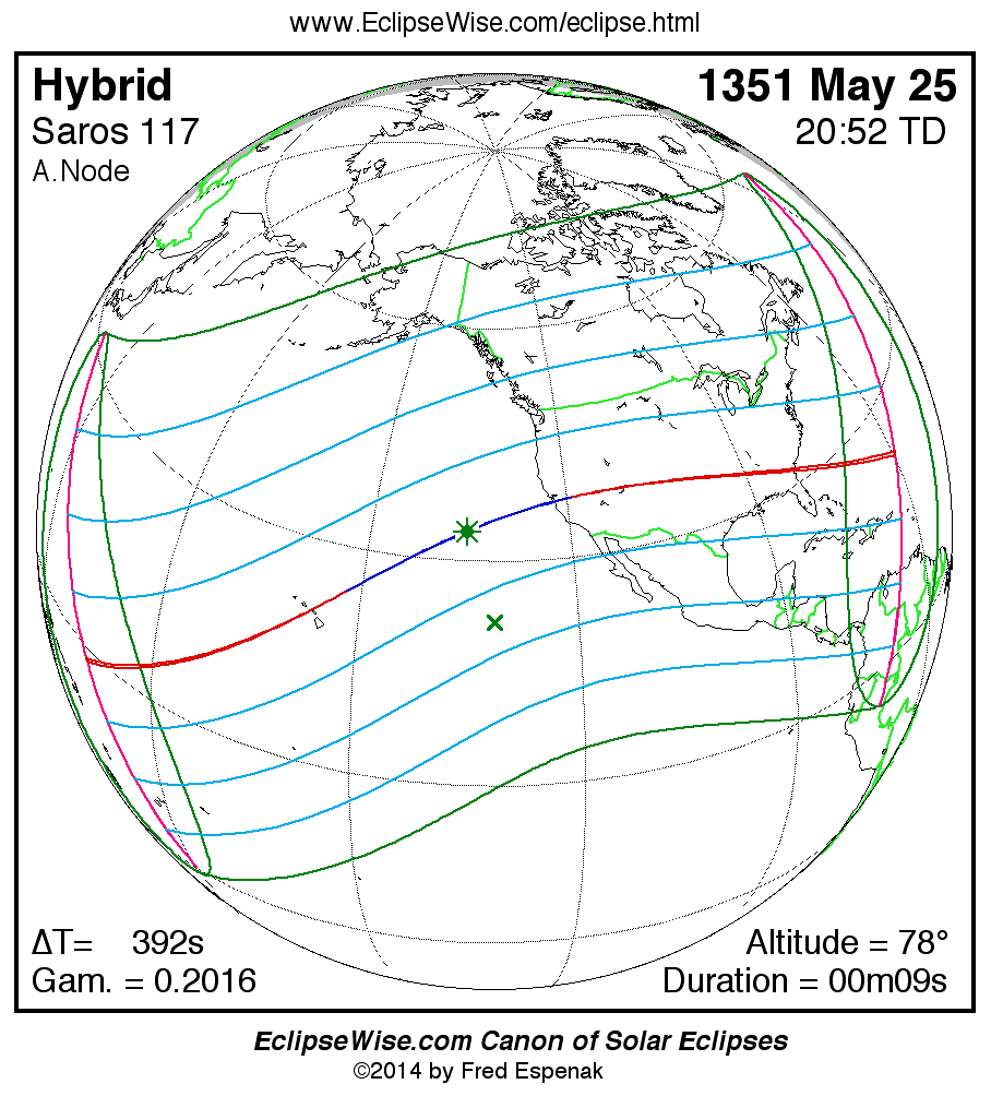 - Orthographic Map: Hybrid Solar Eclipse of 1351 May 25 - global map of eclipse visibility