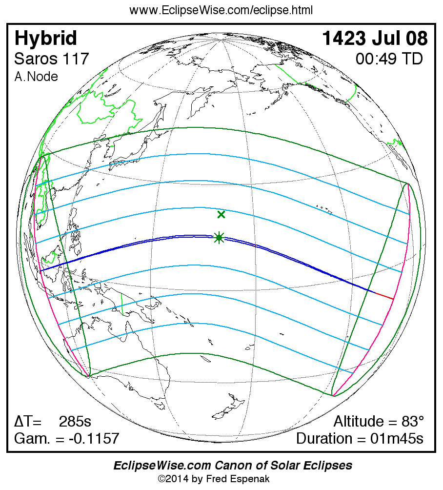 - Orthographic Map: Hybrid Solar Eclipse of 1423 Jul 08 - global map of eclipse visibility