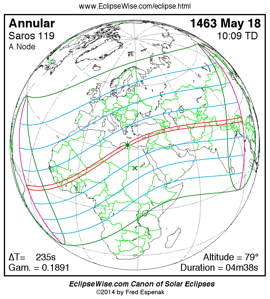 The instant of greatest eclipse takes place on 1463 May 18 at 10:08:50 TD (10:04:55 UT1).