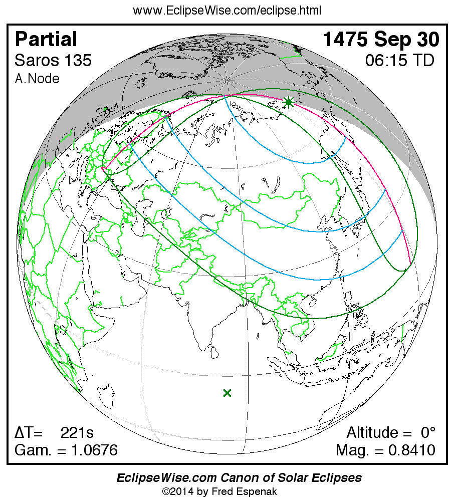 The instant of greatest eclipse takes place on 1475 Sep 30 at 06:15:12 TD (06:11:31 UT1).