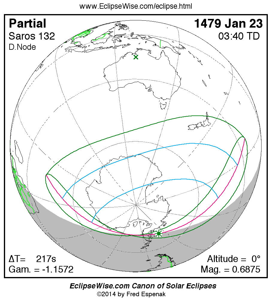 The instant of greatest eclipse takes place on 1479 Jan 23 at 03:39:43 TD (03:36:05 UT1).