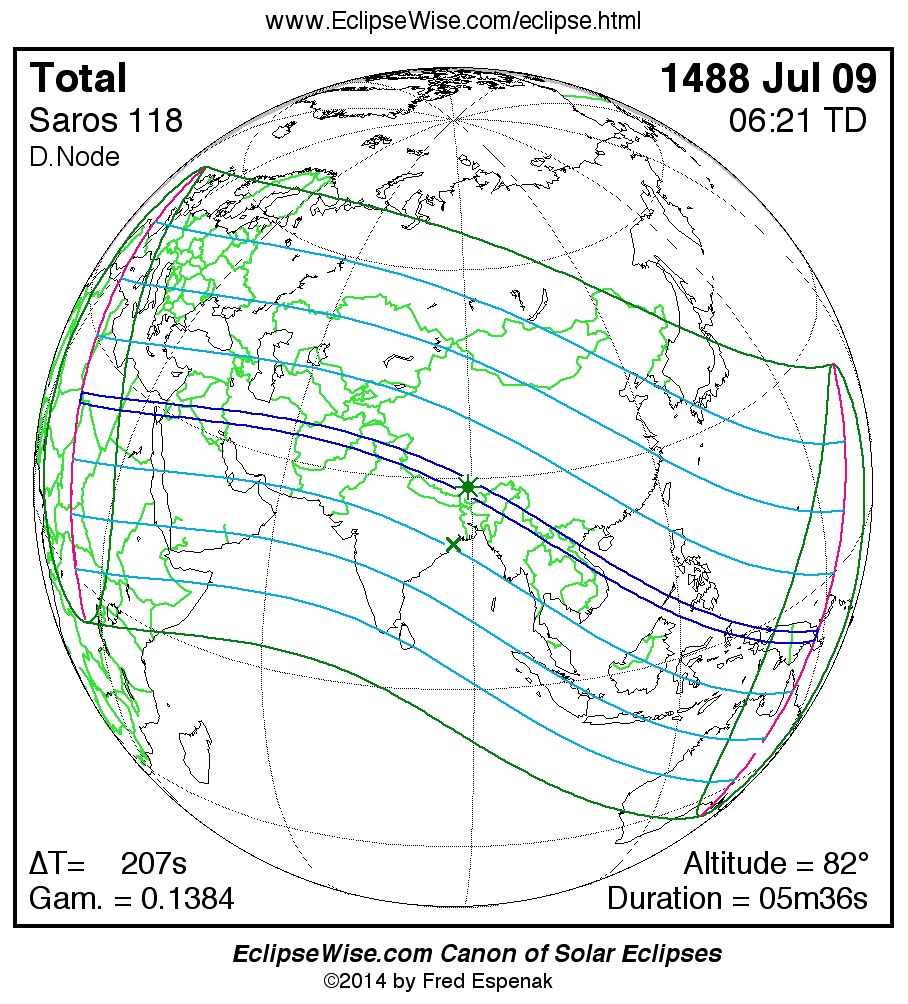 - Orthographic Map: Total Solar Eclipse of 1488 Jul 09 - global map of eclipse visibility