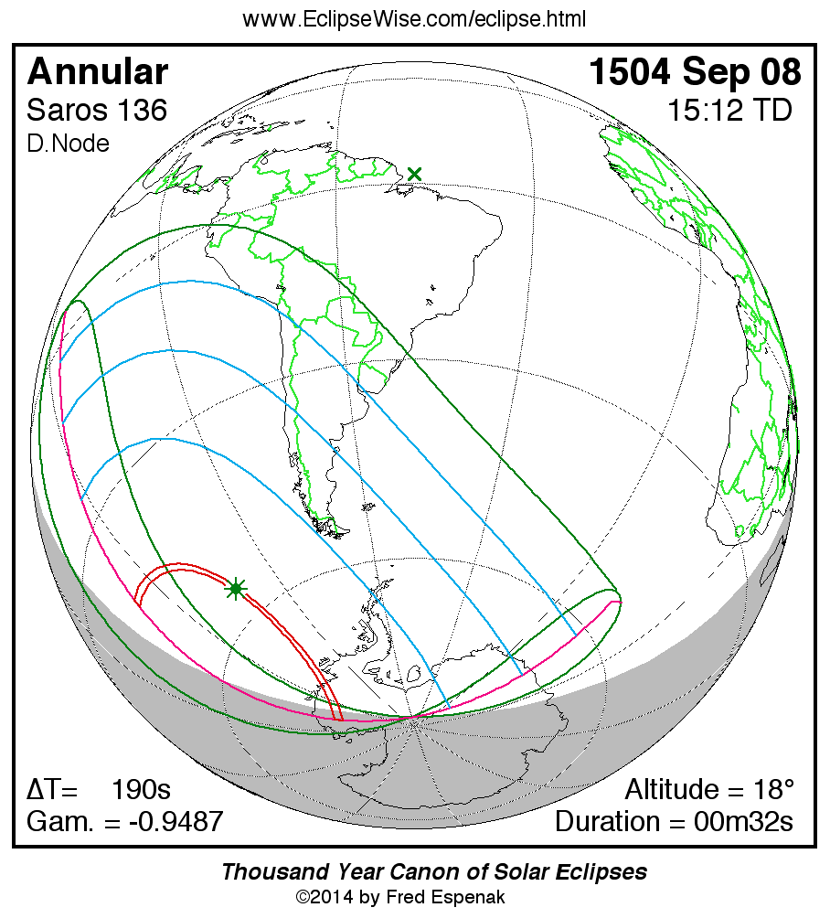 The annular solar eclipse of 1504 Sep 08 is preceded two weeks earlier by a total lunar eclipse on 1504 Aug 25.