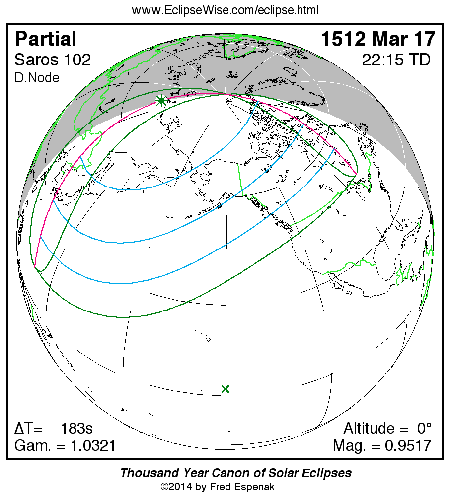 The instant of greatest eclipse takes place on 1512 Mar 17 at 22:14:34 TD (22:11:31 UT1).