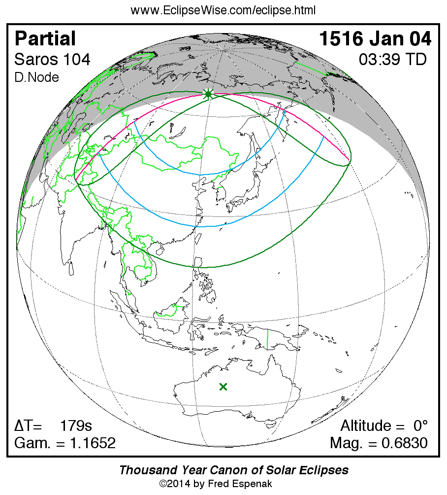 The instant of greatest eclipse takes place on 1516 Jan 04 at 03:38:39 TD (03:35:40 UT1).