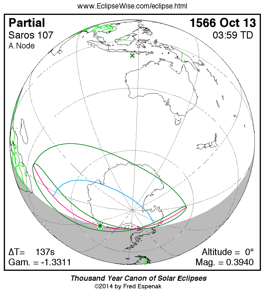 The instant of greatest eclipse takes place on 1566 Oct 13 at 03:59:22 TD (03:57:05 UT1).