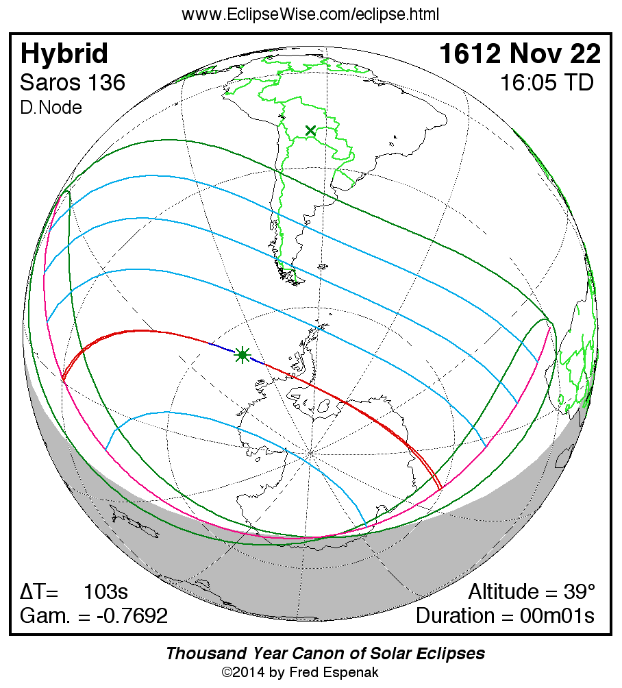 The solar eclipse of 1612 Nov 22 is one of the rare hybrid solar eclipses. In this particular case the eclipse path starts out as annular. Further down the track it changes to total and then back to annular before the path ends. It is a very short hybrid eclipse with a duration at greatest eclipse of 00m01s. The eclipse magnitude is 1.0002, while Gamma has a value of -0.7692.