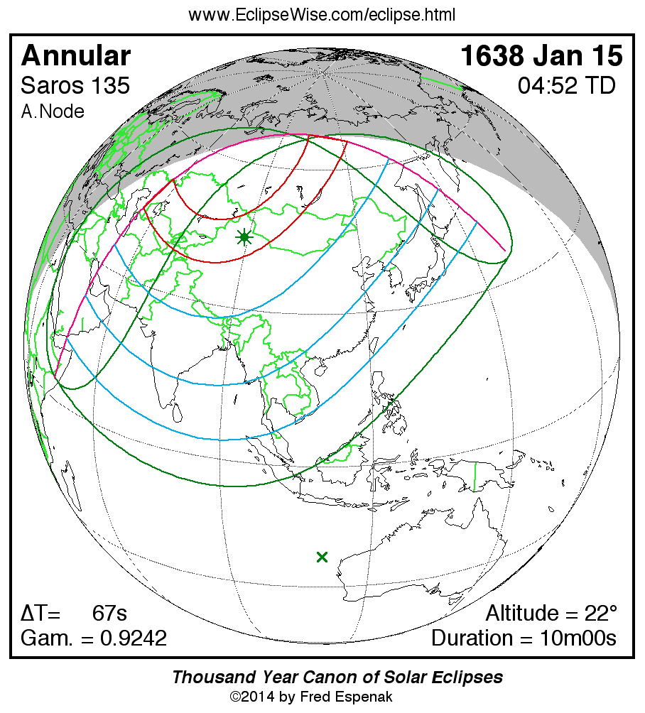 - Path Table: Annular Solar Eclipse of 1638 Jan 15 - coordinates of the central line and path limits